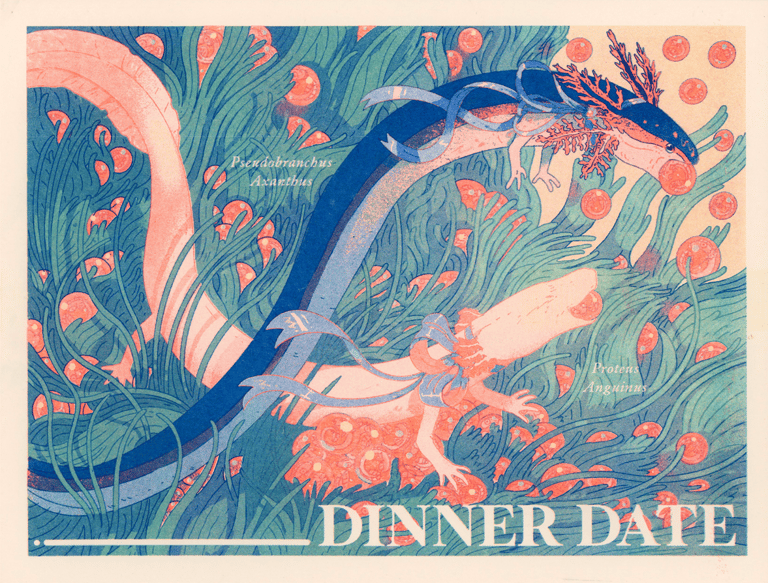 An 8.5 x 11 in. four color risograph print (blue, aqua, yellow, fluro orange) of an olm and a lesser siren on a date together.
