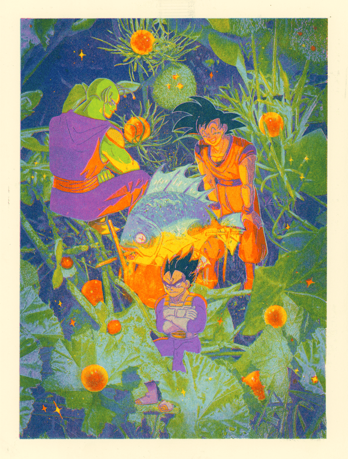 An 8.5 x 11 risograph print, printed in fluro pink, yellow, blue, and aqua ink.