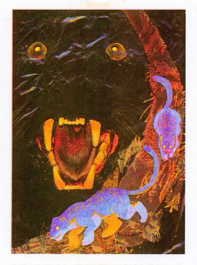 A collage piece, converted into a risograph. Four color (black, aqua, fluro pink, yellow) 8.5 x 11 in.